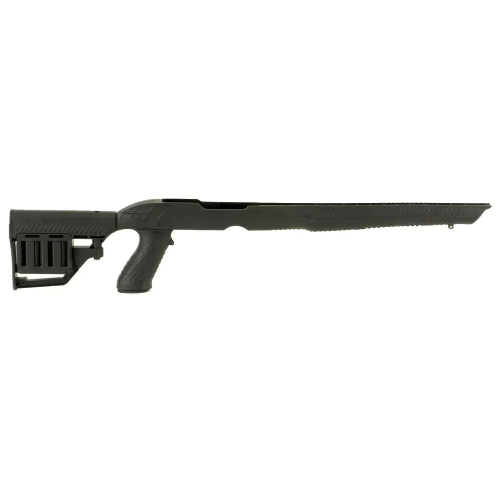 The Tac-Hammer RM4 Stock is the most advanced and versatile stock available for the extremely popular Ruger 10/22 rifle. This innovative stock is loaded with more features than any other on the market. The removable barrel insert provides a custom fit for both standard tapered barrels and .920″ bull barrels. Patented Stowaway accessory rail is concealed in the forend. When reversed, the rail is available for a bi-pod or other accessories. Get custom length-of-pull for proper fit and improved performance with the adjustable M4 type butt-stock, equipped with ambidextrous storage compartments for two spare Ruger rotary magazines. (Magazines not included)