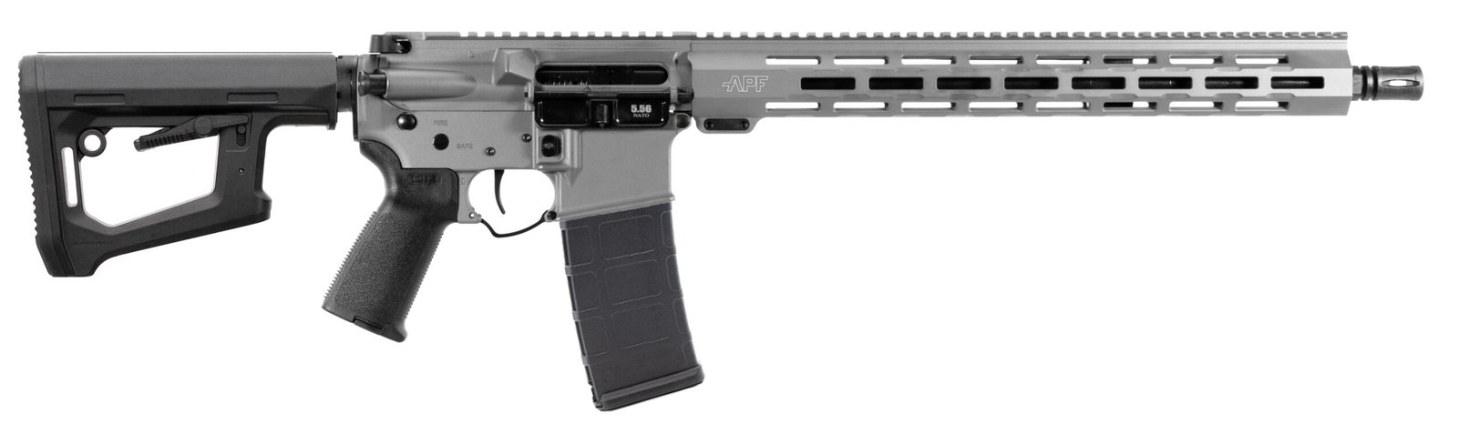 16 4150CM Nitride-Coated Barrel (1:7 Twist) – .750 Mid-Length Gas System – Diamond-Honed Nitride M16 BCG – APF 4.5 lb. Drop-In Trigger – APF Adjustable Gas Block – Magpul MOE PR Stock – Magpul MOE Grip – APF 15 M-Lok Handguard – Forged Receiver – Caliber/ Gauge: 5.56 NATO – Barrel Length: 16 4150CM Nitride- Coated Barrel – Action: Semi-Auto – Front Sight: Rear Sight: None – Color: Bull Shark Gray – Finish: Cerakote – Material: Aluminum – Hand: Right