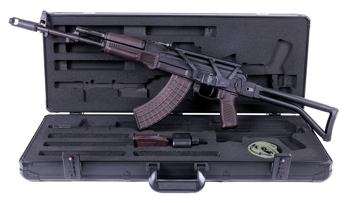 SAM7SF-86 /SAM7SF model 7.62x39mm caliber rifle milled and forged receiver enhanced FCG chrome lined hammer forged barrel 24×1.5mm muzzle right hand threads muzzle brake bayonet and accessory lugs right-side folding tubular buttstock black polymer pistol grip and handguards stainless steel heat shield ambidextrous safety lever scope rail sectional cleaning rod black 10-round magazine black 30rd magazine SM-13 Scope Mount sling oil bottle cleaning kit and Arsenal Hard Case. – SAM7SF-86PM also available with Plum furniture Plum 10rd and Plum 30rd M-47WP magazines. – This package includes a 30rd M-47W magazine SM-13 Scope Mount and the Arsenal Custom Hard Case for SAM7SF AK-47 rifles. The interior is lined with CNC machined hard foam custom designed to fit SAM7SF Series rifle with cut outs for magazines sling cleaning kit and oil bottle. The case is fabricated with aluminum reinforced corners and edges to maximize impact resistance. The combination locks include TSA locks to ensure compliance with TSA regulations. The Arsenal logo is proudly displayed on the top of the case. – Each SAM7SF receiver is milled from a hot-die hammer forged receiver blank by Arsenal Bulgaria. Arsenal’s hot-die hammer forging produces stronger and finer-grained steel. Internal voids and cooling deformations are eliminated by the 5-ton hammer forging process. Each forged receiver blank requires over 5.5 hours of milling before assembly. This forging and milling process is complex and time-intensive but Arsenals meticulous attention to detail delivers a receiver of unequaled strength precision and durability. – Includes FM-922EUS the Enhanced Fire Control Group (FCG) for AK and RPK-based rifles. FIME’s Enhanced FCG includes a single-hook trigger hammer disconnector disconnector springs. FIME’s Enhanced Fire Control Group delivers shortened trigger travel with an extremely smooth and light trigger pull. To prevent lever misfires the disconnector face makes full contact with the hammer. Further the disconnector is engineered with an elongated tail which makes a full stop on the rear trigger guard rivet and the hammer stop prevents the hammer from slamming on the trigger. With these two designs functioning together it eliminates the trigger slap found in competing products. – Caliber: 7.62 x 39 mm – Total length: 38.2 in. (970 mm) – Folded length: 28.35 in. (720 mm) – Barrel length: 16.33 in. (415 mm) – Rifling: 4 grooves – Twist rate: 1:9.44 (1 in 240 mm) – Weight w/o magazine: 8.5 lbs – Muzzle velocity: 2329 fps (710 m/s) – Maximum range: 1350 m (1480 yds) – Rear sight range: 800 m (875 yds) – Rate of Fire: 40 rds/min (practical) – Receiver Milled Receiver – Fire Control FIME Enhanced Trigger – Finish Plum – Magazine 30 Round – Threads 24×1.5mm RH