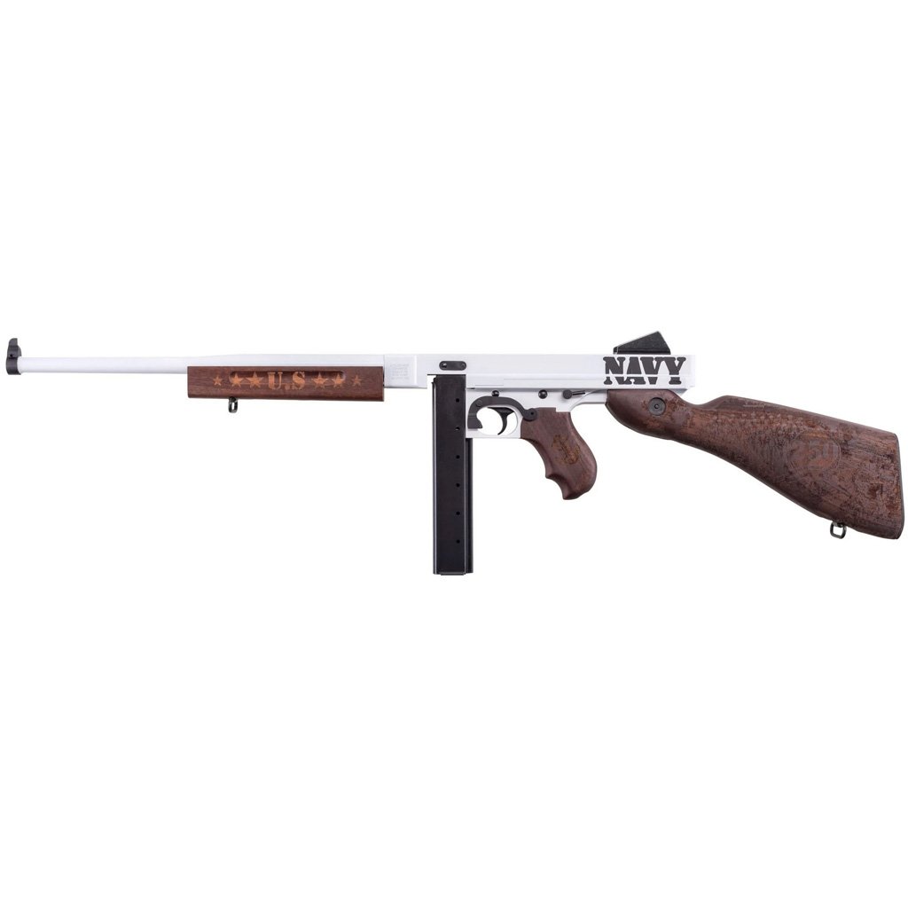 Featuring a striking all-white Cerakote finish across its barrel and receiver, it evokes the crisp, clean lines of a naval uniform. The classic wood furniture provides a rich contrast, elevating its aesthetic appeal. The left side of the receiver proudly displays “NAVY” in bold, authoritative lettering, a clear declaration of allegiance and service. The right side is dedicated to “250TH ANNIVERSARY” engravings and a commemorative crest, marking a significant milestone in naval history. The top of the receiver bears a distinctive black and gold pattern, a subtle yet profound nod to the distinguished gold braid and buttons found on Navy dress uniforms.