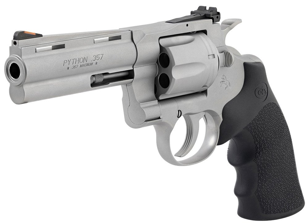 Model: Python – Caliber: 357 – Finish: Bead Blasted Stainless Steel – Action: Double Action – Grips: Hogue – Sight: FT: Red Ramp RR: Adjustable – Barrel Length: 4.25 – Overall Length: 9.75 – Weight: 42 oz – Capacity: 6 – Frame: American Forged Stainless Steel – Features: American Forged Stainless Steel Hogue Grips; D/A Trigger 8lb S/A Trigger 3.5lb