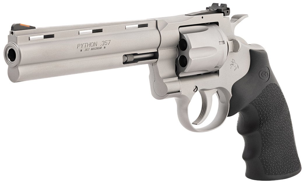 Model: Python – Caliber: 357 – Finish: Bead Blasted Stainless Steel – Action: Double Action – Grips: Hogue – Sight: FT: Red Ramp RR: Adjustable – Barrel Length: 6 – Overall Length: 11.5 – Weight: 46 oz – Capacity: 6 – Frame: American Forged Stainless Steel – Features: American Forged Stainless Steel Hogue Grips; D/A Trigger 8lb S/A Trigger 3.5lb