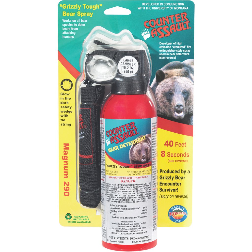 Non-lethal method of defense against aggressive bears. A derivative of Capsicum, a red pepper oil that effects the upper respiratory system, triggering involuntary eye closure and intense burning. Sprays up to 40 feet with 8 seconds of spray time.