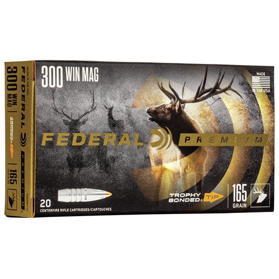 Ammo Caliber: 300 Win. Magnum – Bullet Weight: 165 Grain – Bullet Type: Trophy Bonded Tip – Muzzle Velocity: 3050 ft/sec – Rounds per Box: 20 – Boxes per Case: 10