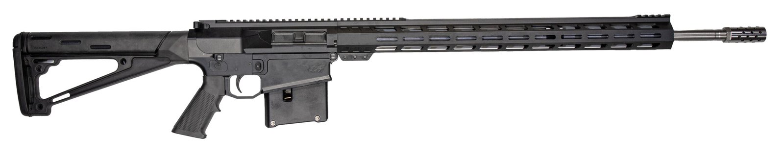 Barrel: 24 superior quality stainless steel (416R) with 5R rifling – Muzzle Brake: 5/8 x 24 stainless steel (416R) – Rifling: 1:8 Twist – Lower: Aluminum billet (7075) – Upper: Aluminum billet – Handguard: 20 Aluminum M-Lok upper picatinny rail – Gas Block: .750 4150 Steel Black Oxide Coated – Gas System: Rifle – Stock: Hogue fixed rifle stock black – Grip: Standard – BCG (Bolt Carrier Group): Custom design – Charging Handle: Custom design – AR-10 Compatible parts: Lower parts kits trigger safety – Magazine: GLFA custom aluminum 5 round black – Magazine has open witness window and tabs to pull down for easy loading