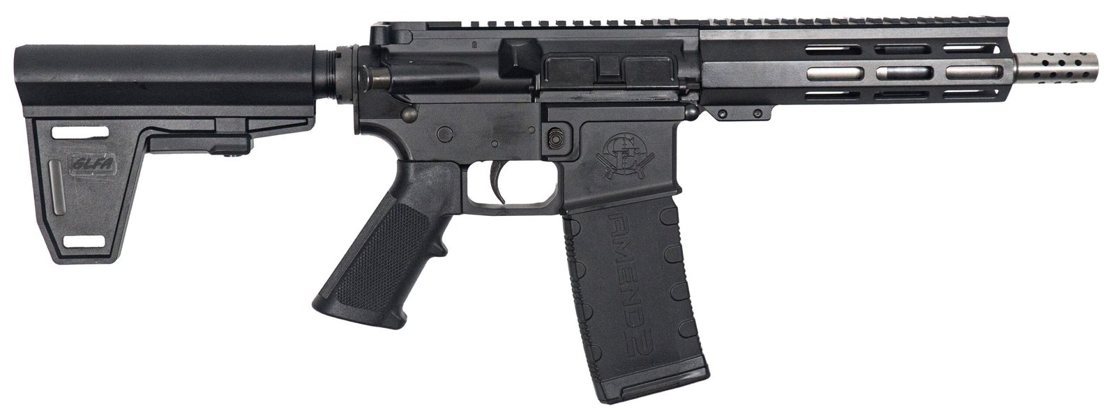 Type: AR15 Pistol – Finish: Cerakote – Caliber: .223 Wylde – Barrel: 7.5 – Barrel Options: 416R Stainless Steel – Rifling: 1:8 Twist – Thread Pitch: 1/2×28 – Feed Ramp: M4 – Lower Receiver: Billet Aluminum 7075 – Upper Receiver: Forged Aluminum – Gas Block: . 750 – Handguard: 15.25 Aluminum 6061 M­LOK with Full Top Picatinny Rail – Trigger: Mil-Spec – Custom Muzzle Device – Pistol Brace: G-Force GFAB001 Ace of Brace Adjustable 5 Position Brace
