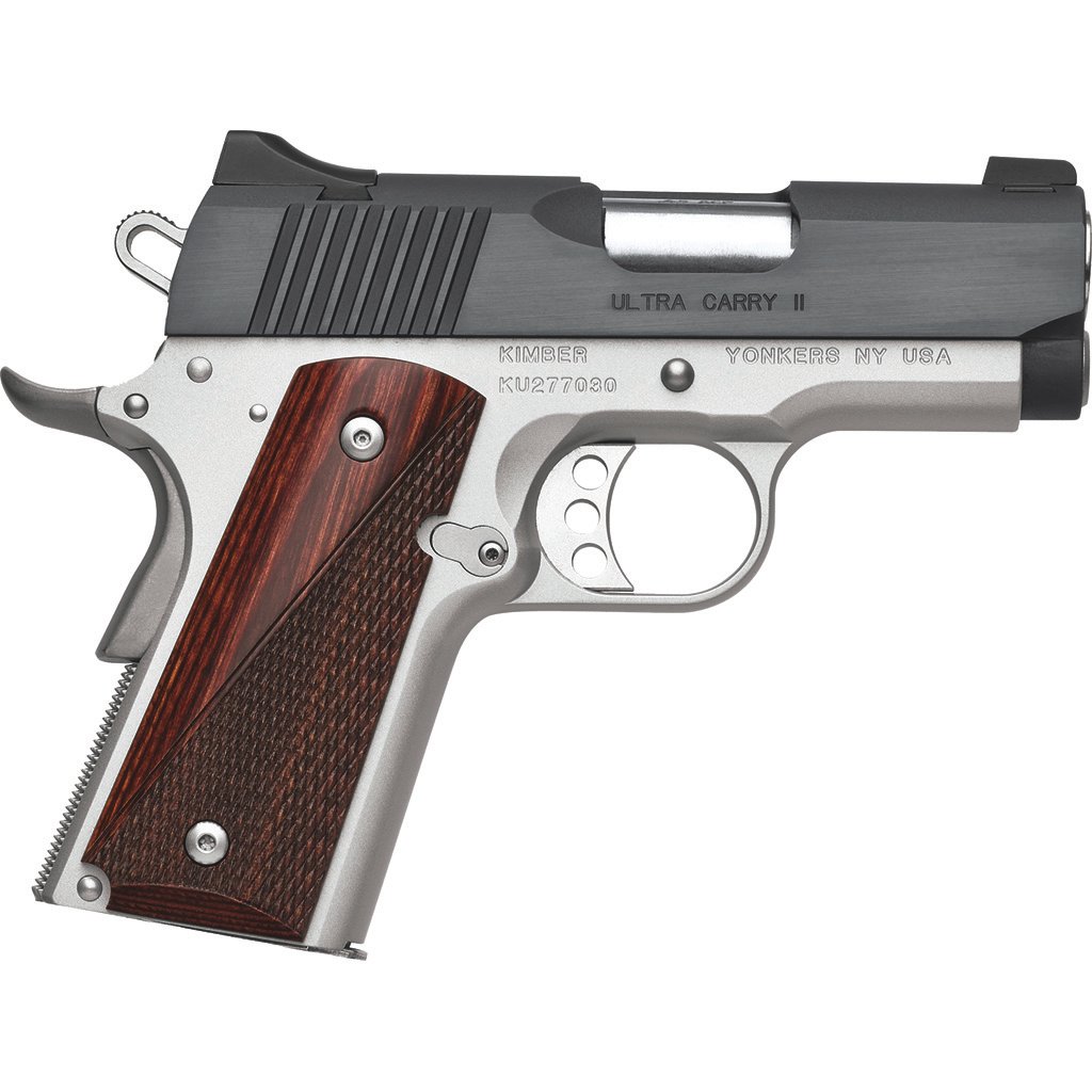 The Ultra Carry II is a hallmark of Kimber quality, complete with a brushed-polished carbon slide, aluminum frame and smooth/checkered rosewood grips.