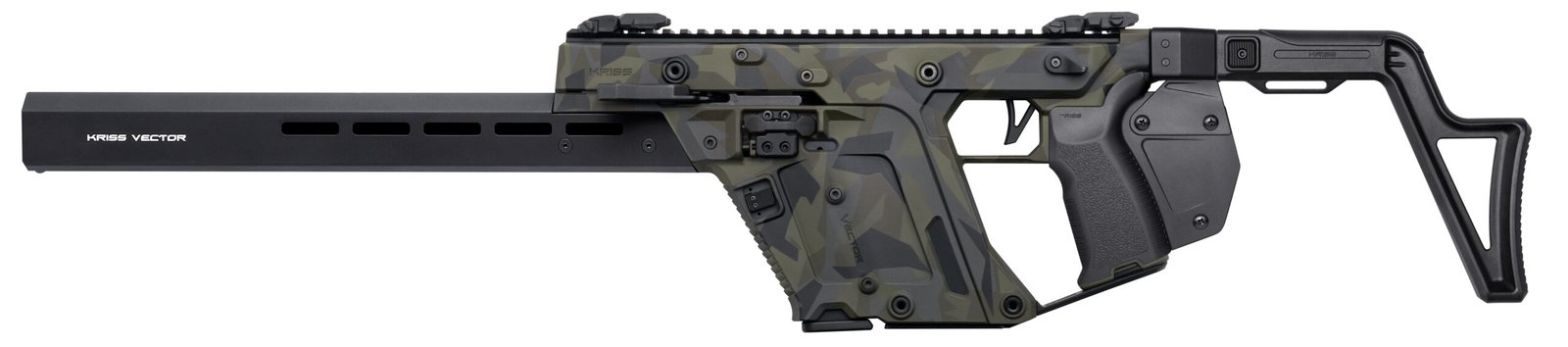 Tailored for recreational use and competition in pistol caliber carbine divisions the KRISS Vector Gen 3 CRB is the most accessible model with a 16 rifle length barrel and is compliant in most states. The upper and lower housings have been reimagined and enhanced for adaptability. The CRB comes equipped with a refreshed barrel shroud with M-LOK® mounting points. – The CRB is fed with full size Glock® magazines ensuring seamless interchangeability for users familiar with Glock-style mags. – REDESIGNED HOUSINGS – INTERCHANGEABLE PISTOL GRIP SYSTEM – AMBIDEXTROUS ADJUSTABLE FOLDING STOCK – M-LOK BARREL SHROUD – AMBI MAG RELEASE & REDESIGNED CONTROLS – Skeletonized Trigger with 0.7mm Pre-Travel – Ambidextrous Short Throw Safety Lever – Gen 3 Bolt Release and Mounting Block – Full Length MIL-STD 1913 Picatinny Top Rail – Short Charging Handle / Brass Check Function – 4-Pin Tool-Less Disassembly – Caliber 45ACP – Model Vector CRB – Action Semi-Automatic – Operating System Closed Bolt Delayed Blowback – Barrel Length 16.0 in / 406.4 mm – Overall Length Collapsed 34.9 in / 887.5 mm – Overall Length Extended 36.9 in / 937.5 mm – Magazine(s) included (1) 10 Rounds – Color Woodland Delta CERAKOTE® Coating – Weight 7.7 lbs / 3.5 kg – Barrel Material 4140 Chrome Moly – Barrel Finish Black Nitride (QPQ) – Barrel Threading .578×28 RH – Trigger Type Pivoting Single Stage – Stock KRISS Ambidextrous Telescopic Folding Stock – What’s in the Box – (1) KRISS Vector Firearm – (1) Magazine – (1) Cleaning Kit – (1) Cable Lock – (1) User Manual – (1) Warranty Card