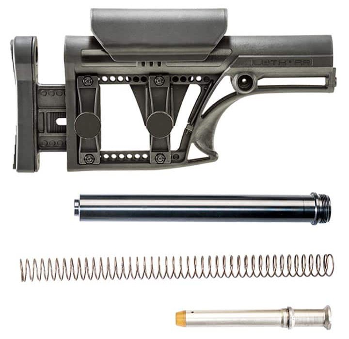 The MBA-1 fixed Rifle Buttstock Assembly is a complete kit that includes everything you need to assemble an A2 rifle buffer system on your .308/7.62 AR lower. The kit includes an MBA-1 Buttstock that features adjustable Length-of-Pull and adjustable Cheek Rise in a lightweight affordable rifle buttstock. Comes complete with A2 Buttstock extension tube Standard Buffer and a .308/7.62 Buffer Spring. The modular design of the MBA Buttstock allows you to configure your buttstock to your specific and personal needs. The MBA features multiple attachment points for a sling including molded pockets that will accept Grovtec QD cups sold separately. A rail attachment is available. – Modular buttstock assembly for the AR – Interchangeable with standard A1 or A2 buttstocks or any aftermarket buttstock with overall length of approximately 10.5 – Length: 10 3/8 ( 11.5 extended ) – Comes with rifle buffer tube rifle buffer and spring – Sling Swivels (Side or Rear) Sold Separately – Not interchangeable with carbine rifles with telescoping assemblies. – Fully Ambidextrous and can be comfortably used shooting off either shoulder (Cheek piece pre-installed for right handed shooters but can be installed on either side for right or left hand shooters) – Specifications: – Buttstock Type MBA-1 – Buffer Tube Rifle – Buffer Weight 5.3 oz – Caliber .308/7.62 – Buttstock Weight 18.4 oz – Application Rifle – Cheek Rise 1 Fully Extended – Additional Length-of-Pull 1 1/16 – Collapsed Length-of-Pull 10.5 – Extended Length-of-Pull 11 1/2