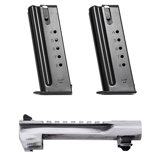 Convert your Mark XIX Desert Eagle .50AE to a .44 Magnum with this conversion kit! Conversion kit includes one Desert Eagle .44 Magnum 6 White Matte Distressed Barrel and two 8 round Magazines