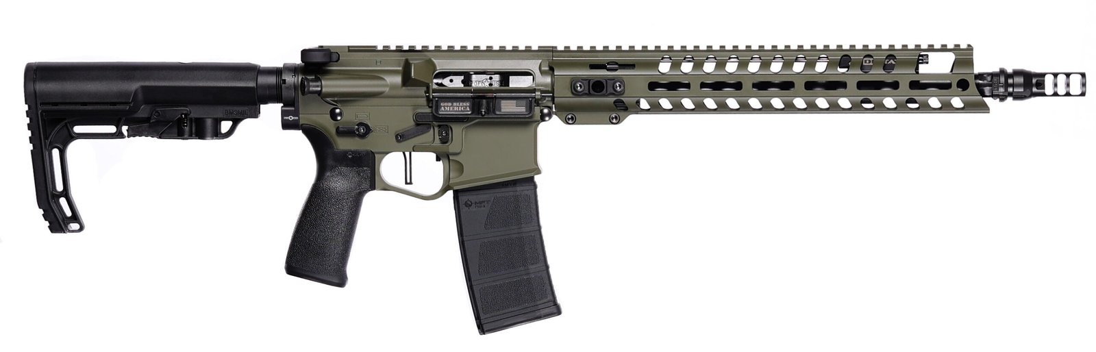Nitride 13.75 Barrel – Pinned & Welded Dead Air Keymo Muzzle Break for Overall Length of 16.1 – 1-8 Twist 5R Right Hand lands/grooves – 13 Renegade rail system – Mid-Length Dictator Adjustable Gas Block – Dead Air Keymo Muzzle Break