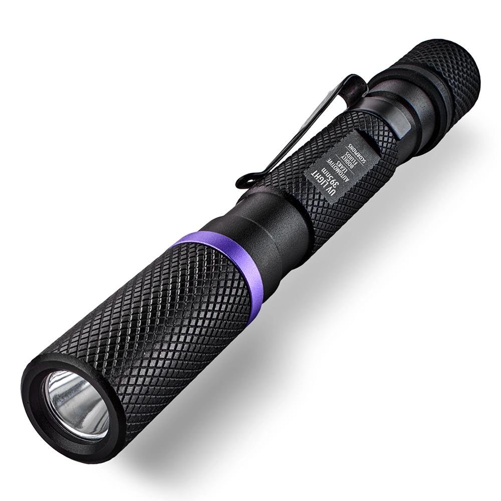 Detect and inspect. See what needs to be seen. Our ultra-slim 395nm UV Flashlight can reveal undetectable materials not seen through normal lighting. Automotive leaks machinery fluids pet urine blood – this handy penlight lets you see it all. It’s constructed of lightweight aluminum and powered by 2 Police Security AAA batteries (included).