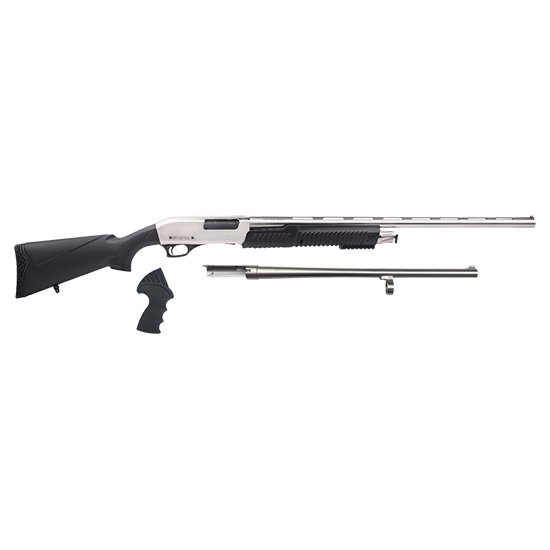This three-in-one shotgun comes ready to tackle any self defense tactical or sport shooting need. Built with 18.5” cylinder bore smooth barrel and 28” vent rib barrel with a 4+1 capacity. Add a synthetic rear removable stock and optional pistol grip to form a shotgun package that can provide in the field or defend in the perimeter. – Caliber: 12 Gauge – Action: Pump Action – Capacity: 4 + 1 Rounds – Weight Unloaded: 2.8kg. / 6.17lbs. – Overall Length: 990mm / 39in – Barrel Type: Contoured – Barrel Length: 470mm / 18.5in – Front Sight: Bead – Rear Sight: Serration On Receiver – Receiver: Marine Chrome – Stock: Polymer – Choke: Slug Full Modified and Improved Cylinder