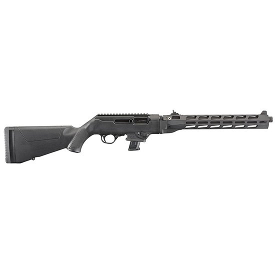 Caliber: 9mm Luger – Stock: Black Synthetic with Aluminum Free-Float Handguard – Capacity: 10 – Barrel Length: 16.12 – Overall Length: 34.37 – Barrel Feature: Threaded Fluted – Front Sight: Protected Blade – Rear Sight: Adjustable Ghost Ring – Thread Pattern: 1/2-28 – Weight: 7 lb. – Length of Pull: 12.62 – 14.12 – Material: Aluminum Alloy – Finish: Type III Hardcoat Anodized – Twist: 1:10 RH – Grooves: 6 – CNC-milled handguard that is Type III hard-coat anodized aluminum for maximum durability with Magpul® M-LOK® accessory attachment slots on all four sides for easy mounting of M-LOK-compatible rails and accessories. – Interchangeable magazine wells for use of common Ruger® and Glock® magazines. Ships with SR-Series™/Security-9® pistol magazine well installed and an additional magazine well accepting Glock® magazines is included*. Ruger American® Pistol magazine wells are available at ShopRuger.com. – Easy takedown enables quick separation of the barrel/forend assembly from the action for ease of transportation and storage. Takedown is as simple as locking the bolt back and verifying that the rifle is unloaded pushing a recessed lever twisting the subassemblies and pulling them apart. – Dead blow action features a custom tungsten dead blow weight that shortens bolt travel and reduces felt recoil and muzzle rise. Bolt is machined from heat treated chrome-moly steel to ensure strength structural integrity and durability. – Reversible magazine release and reversible charging handle to support ambidextrous use or one-handed control manipulation while maintaining a proper firing grip*. – Cold hammer-forged chrome-moly steel barrel with ultra-precise rifling provides exceptional accuracy and longevity. The heavy contour barrel provides consistent accuracy while barrel fluting sheds unnecessary weight and allows for quick handling. – Threaded barrel with included thread protector allows for use of standard muzzle accessories. – Accurate sighting system with adjustable ghost ring rear aperture sight and non-glare protected blade front sight. – Soft rubber buttpad with spacers allows the rifle to be properly sized for different shooters or varying levels of outerwear or defensive gear (three 1/2 spacers included). – Durable glass-filled nylon synthetic buttstock features a proprietary texture for enhanced control and an integral sling mount for rapid sling attachment . – Light crisp trigger pull with minimal overtravel and positive reset utilizing proven 10/22® trigger components. – CNC-machined from an aerospace-grade 7075-T6 aluminum billet the receiver includes an integrated Picatinny rail and is Type III hard-coat anodized for maximum durability. – Also includes: one SR-Series™ pistol magazine and hex wrenches for rear sight adjustment buttpad spacer adjustment and charging handle removal.