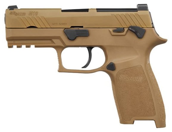 The SIG SAUER M18 is the official sidearm of all branches of the U.S. Military and the official sidearm of the U.S. Marine Corps. The commercial M18 brings the same unprecedented accuracy extreme reliability and unmatched durability the military demands coming standard with SIGLITE night sights and a removable night sight rear plate. The optic ready slide is directly compatible with ROMEO-M17 red dot optic. The slide and grip module are the same coyote tan as the military version and it includes (3) 10rd steel magazines. The SIG SAUER M18…chosen by the U.S. Marine Corps and the U.S Military now available to you for the first time. – Commercial release of the MHS M18 – Coyote PVD Finish – MHS Slide assembly with single screw sight plate configuration now compatible with Romeo-M17 – Deltapoint Pro Optic Footprint and compatible with ROMEO-M17 Red Dot Optics – M18 serial number series – (3) 10rd steel magazines – CALIBER 9mm Luger – PISTOL SIZE Carry – MAGS INCLUDED(3) 10rd steel magazines – SIGHTS SIGLITE Front / Night Sight Rear Plate – OPTIC READY Yes – RX FOOTPRINT M17/M18 MHS: Deltapoint Pro & Romeo-M17 – SIGHT RADIUS 5.8 in – SLIDE FINISH Coyote M17 PVD – SLIDE MATERIAL Stainless Steel – ELECTRO-OPTIC INSTALLED No – TRIGGER ACTION Striker – TRIGGER TYPE Striker Fired w/Curved Trigger – MANUAL SAFETY Yes – FRAME FINISH Stainless Steel – FRAME MATERIAL Stainless Steel – GRIP MODULE Standard Coyote Carry Medium Grip – GRIP COLOR Coyote Tan – ACCESSORY RAIL M1913 – BARREL LENGTH 3.9 in [99.06 mm] – THREADED BARREL No – BARREL MATERIAL Carbon Steel – OVERALL LENGTH 7.25 in – OVERALL WIDTH 1.5 in – HEIGHT 5.5 in – WEIGHT 28.1 oz