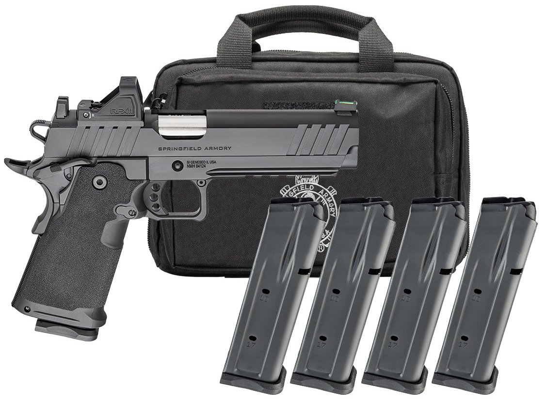 The Prodigy from Springfield Armory takes the proven 1911 platform and enhances it with double-stack capacity and a performance-driven feature set. Reconfigured around a double-stack magazine the Prodigy’s polymer grip module mounts to its forged steel frame offering capacities of 17+1 and 20+1. Optics ready with an ambidextrous safety and Picatinny rail the Prodigy combines the most beloved characteristics of the 1911 with modern capacity for unrivaled performance. – Caliber 9mm – Color Black – Barrel 5 Forged Stainless Steel Match Grade Bull 1:16 – Slide Forged Carbon Steel Black Cerakote® Optics-Ready – Frame Forged Carbon Steel Black Cerakote® – Sights Fiber Optic Front Black Serrated Rear Viridian RFX11 – Recoil System 2 Piece Full Length Guide Rod – Grips Polymer – Magazines (3) 17-Round (1) 20-Round – Weight 33 oz – Length 8.5 – Height 5.5
