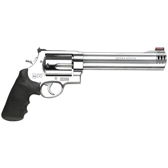 Action: SA/DA – Caliber: .500 S&W Magnum – Capacity: 5 – Finish: Stainless – Material: Steel – Grips: Black Synthetic – Sights: Light Gathering HI-VIZ® Red Dot / Adjustable – Barrel Length: 8.38 – Overall Length: 15 – Weight: 72.5 oz – Most Powerful Production Revolver in the World Today – Massive .500 S&W Magnum® Cartridge – 2600 ft/lb. Muzzle Energy – A Hunting Handgun For Any Game Animal Walking – Removable High Efficiency Compensator – HIVIZ® Red Dot Interchangeable Front Sight – In 2003 the gunsmiths and engineers at Smith & Wesson wanted to deliver maximum power for serious handgun hunters. The power they sought required an entirely new frame the massive X-Frame and was the basis for the new Model S&W500 the most powerful production revolver in the world. This ushered in the era of the big gun and was only the beginning. For ultimate power and velocity there’s nothing even close to an X-Frame model handgun.