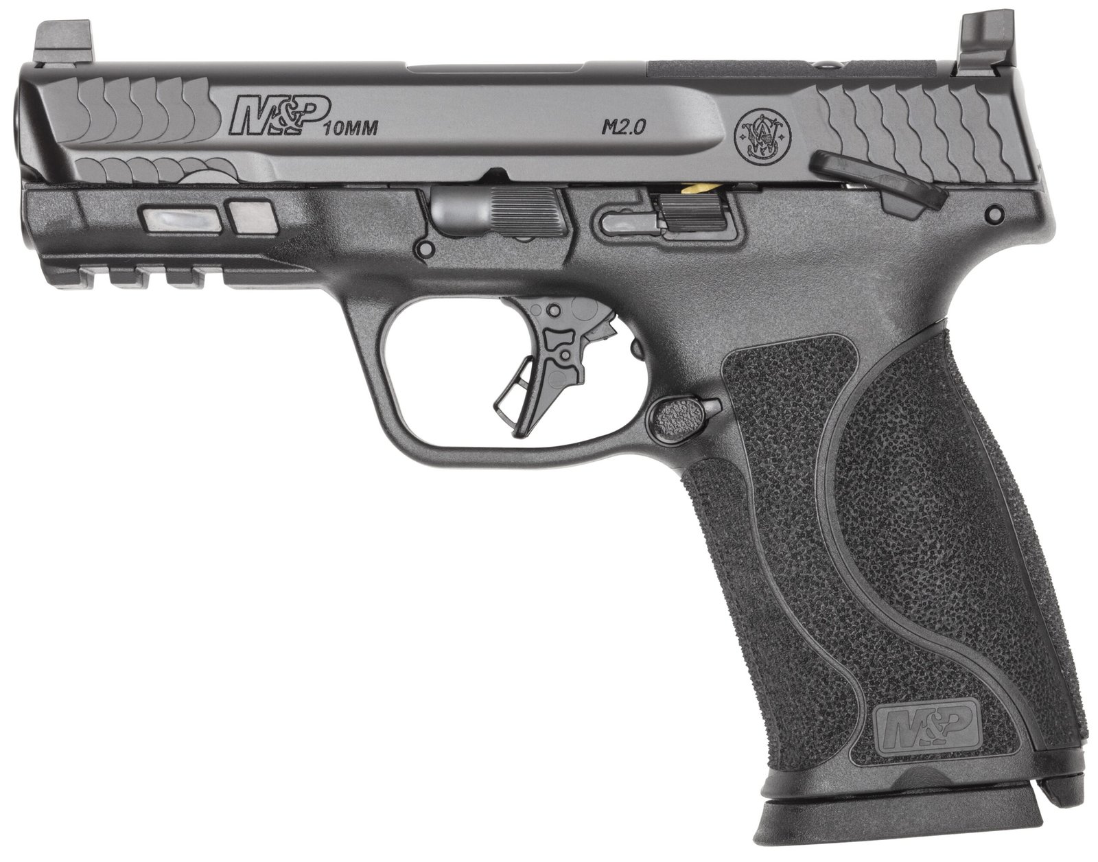Building off of the successful launch of the M&P10MM M2.0. A shorter slide and barrel makes this a more convenient package. Reversible magazine release. The M2.0 flat-face trigger for consistent finger placement that allows for more accurate and repeatable shooting. Enhanced sear for lighter crisp trigger let-off. A perfect option for those looking to step up their game. – ADAPTABLE GRIP- Four interchangeable palmswell grip inserts included to tailor the pistol for optimal hand fit and trigger reach- S M ML L. – FLAT-FACE TRIGGER- For consistent trigger finger placement that allows for more accurate and repeatable shooting. – OPTIC-READY SLIDE- The ability to mount most red dots on the market with the Smith & Wesson C.O.R.E. system. – 4 1:10 twist stainless steel barrel w/Armornite® finish. – Optic ready C.O.R.E. System. – Flat-face trigger. – 18 degree grip angle. – Optic-height white dot sights. – Manual Thumb Safety. – Stainless steel slide w/Armornite® finish. – Four interchangeable palmswell grip inserts. – Ships with two 10-round magazines. – width 1.3 in – length 7.2 in – height 5.6 in – weight 28.5 oz – CALIBER 10MM – SIZE FULL – CAPACITY 10 – ACTION STRIKER FIRED – BARREL LENGT H4 – GRIP POLYMER – SIGHTS OPTIC-HEIGHT WHITE DOT – OPTIC READY YES – SAFETY THUMB SAFETY – COLOR/FINISH BLACK – STATE COMPLIANCE CO CT DE HI IL MD NJ NY RI VT WA DC – BARREL MATERIAL STAINLESS STEEL – FRAME POLYMER – NUMBER OF MAGAZINES 2 – MODEL M&P 2.0