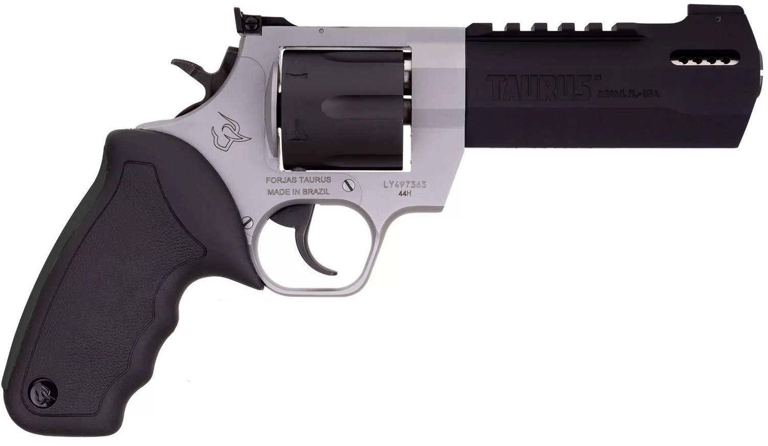 Winner of the 2019 American Hunter Handgun of the Year Golden Bullseye Award the Taurus Raging HunterT is a next-generation big-bore revolver that’s first in innovation-and built to last. A fun and effective alternative for short- to medium-range hunting scenarios this five-shot revolver is chambered in 454 Casull and is available in Matte Black or Two Tone finish. Its revolutionary angular barrel design cuts down on overall weight while its factory tuned porting and gas expansion chamber reduces muzzle lift for quicker target acquisition. Cushioned insert grips ensure a comfortable controllable shooting experience. – Frame Size: Large – Capacity: 5 rds – Action Type: DA/SA – Caliber: 454 Casull – Height: 6.50 – Width: 1.80 – Weight: 50.00 oz. – Barrel Length: 5.12 – Overall Length: 10.90 – Front Sight: Fixed – Rear Sight: Adjustable – Safety: Transfer Bar