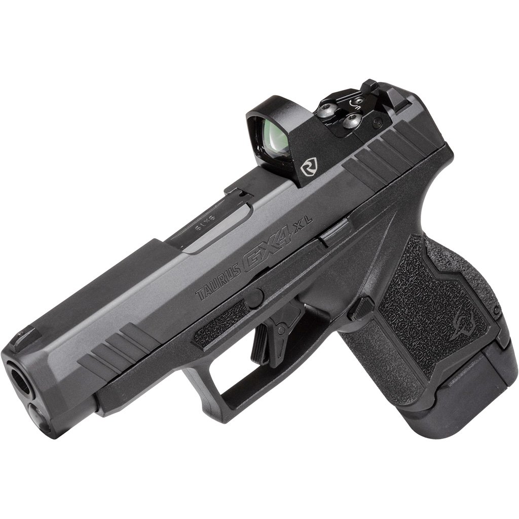 Longer slide adds 1 inch of length when compared to the GX4—increasing muzzle velocity and sight radius, making it easier to maintain accuracy. T.O.R.O. (Taurus Optic Ready Option) slide. Direct thread, no plate system accommodates today’s most popular red dot optics. A DLC coated stainless steel barrel ensures reduced friction and greater wear and corrosion resistance no matter the elements. Standard backstrap profile features a slight palm swell. Those who favor a higher wrist position for natural point-of-aim can install the included high-swell backstrap. 11- or 13-round magazine options for increased versatility and added peace of mind. A blackout steel serrated drift adjustable rear sight and fixed (white dot) front sight promote fast target acquisition when not running a red dot. Flat faced target trigger delivers accuracy and predictability courtesy of its crisp, precise sear break and the pleasingly short and tactile reset that is fundamental to quick, on-target follow-up shots. Carry-friendly carbon steel slide boasts a gas nitride coating to maximize slide surface hardness that shooters can depend on in any application.