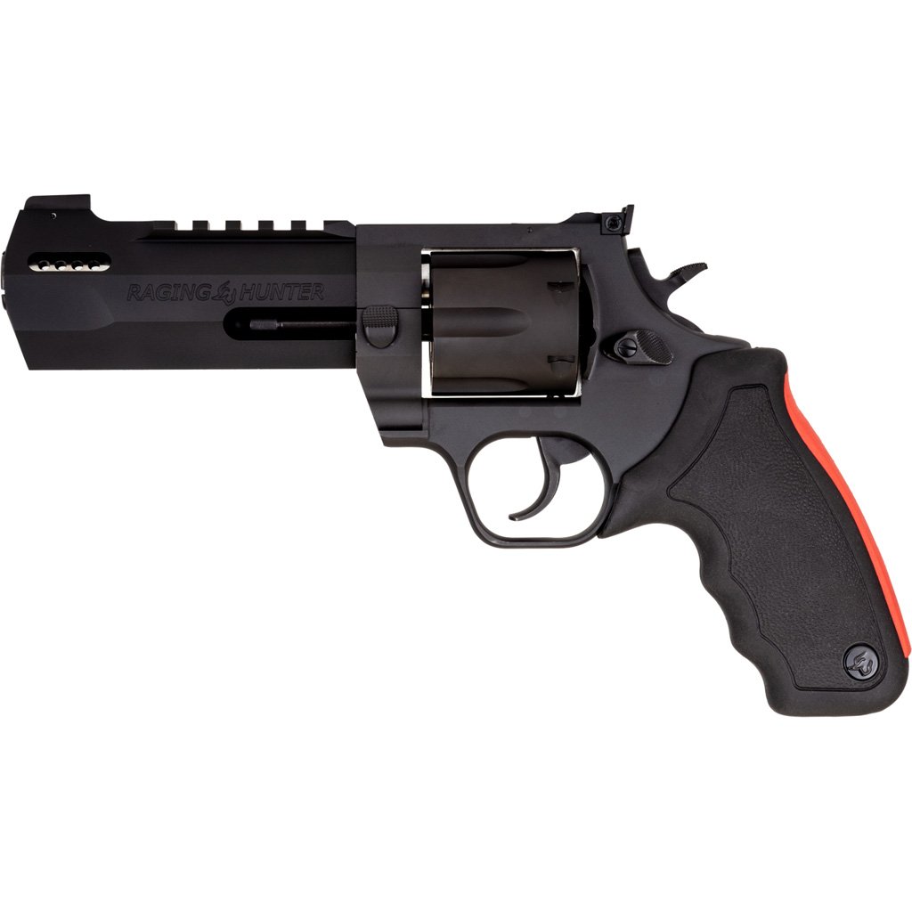 The Taurus Raging Hunter is a 6-shot .44 Magnum revolver built with hunters and outdoorsmen in mind. The angular barrel reduces weight, while its factory tuned porting and gas expansion chamber reduce recoil and muzzle lift. This large frame Raging Hunter has a 5.12” barrel and weighs 49 ounces. A cushioned insert grip aids in comfort and allows for a solid and secure grip. This model has a matte black oxidized finish.