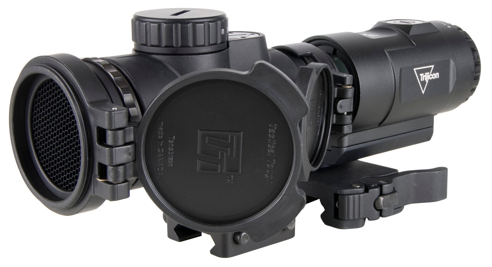 The Trijicon Miniature Rifle Optic (MRO®) is a reflex-style sealed sight intended for use on rifles carbines and shotguns to provide fast target acquisition. It is designed to be used with both eyes open providing the operator with maximum situational awareness. The large aperture and tapered light path maximizes the viewing area in such a small optic allowing for fast target engagement especially from non-standard shooting positions. It also features ambidextrous brightness controls sub-flush adjusters advanced lens coatings and a fully sealed waterproof hard anodized forged 7075-T6 housing making the MRO SD the ultimate mini reflex sight. – The MRO SD is optimized for use with a magnifier with a re-engineered objective lens to produce a refined 2.0 MOA center dot surrounded by a 68 MOA segmented circle reticle. The ambidextrous reticle and brightness control allows the user to choose between a full reticle or center dot only. – The Trijicon Miniature Rifle Optic (MRO®) SD Magnifier is a 3 power reflex optic magnifier specifically designed to magnify the target and target seen through the MRO SD red dot optic. By magnifying the target the shooter is able to use the crisp dot in the MRO SD to quickly and accurately engage targets at extended distances. The MRO HD Magnifier is short and compact which saves weight and rail space. The design features easy-to-set flush toolless adjusters that make centering the reticle in the field of view easy. The adjustable diopter allows the user to tune the optical performance to their eyes. – The 3x magnifier also includes a multi position military-grade flip-to-side quick release levered mount which makes mounting and unmounting the optic from the host platform quick and easy. This mount is also designed to flip into place over the top of back up iron sights commonly used on modern sporting rifles. Each magnifier includes a riser plate and additional fasteners to allow the optic to align with either 1/3rd or Full Co-Witness MRO SD mounts. – INCLUDES – Full Co-Witness Mount (AC32070) – 3x Magnifier and Quick Release Flip-to-Side Mount – Trijicon Logo Sticker – Lens Cloth – MRO and MRO HD Magnifer Manual – Warranty Card – Mounting Tools – Specs – Length x Width x Height 2.9 in x 1.7 in x 2.1 in (73.66mm x 43.18mm x 53.34mm) – Weight 4.8 oz. (136.08g) – Magnification 1x – Objective Size 25mm – Reticle Pattern 2.0 MOA Dot – Day Reticle Color Red – Night Reticle Color Red – Illumination Source LED – Illumination Settings 8 – Power Source 1 CR2032 Lithium Battery – Battery Life 2.5 years of continuous use at day setting 3 (setting 5 of 8) at 70°F (21°C) – Adjustment 1/2 MOA Per Click – Adjustment Range 70 MOA Total Travel – Eye Relief Infinite in. – Mount Full Co-Witness Mount – Housing Material 7075-T6 forged aluminum – Finish Matte Black – Submersion Depth 100 ft. (30m)