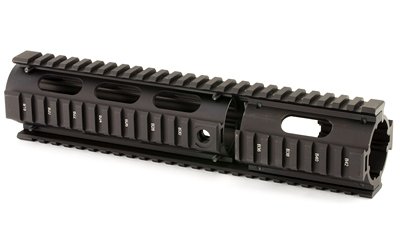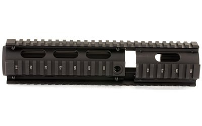 The UTG pro Model 4/15 Extended carbine length drop-in quad rail fits model 4/15 carbines with rails extending beyond front sight. It has picatinny rails with 19 top slots, 23 bottom slots and 25 left/right slots.