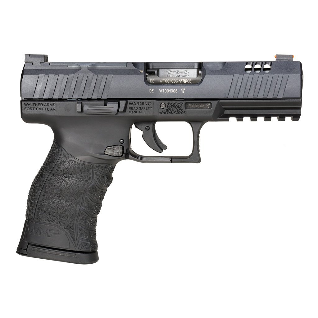 Walther WMP Optic Ready Semi Auto Pistol in 22 WMR. 4.5 in. barrel. Black optics ready aluminum slide and polymer frame. fiber optic front sight and black nothch rear. 2×15 rd. magazine. Ambidextrous paddle and button mag release.