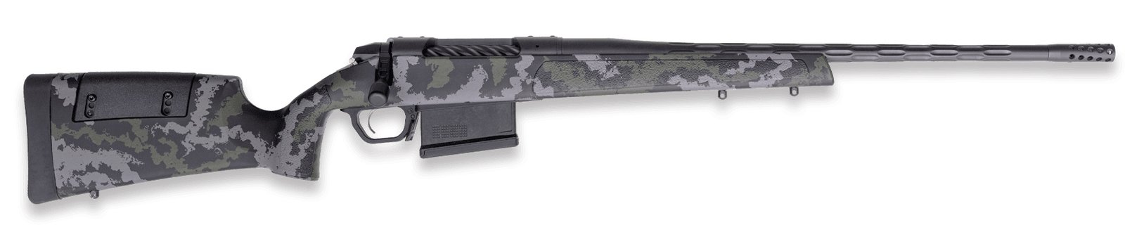 The Range XP 2.0 is built on Weatherby’s newest bolt action rifle platform the Model 307. Meant to complement the historic Mark V® and Vanguard® lineups the Model 307 action is a 2-Lug fully cylindrical action compatible with many aftermarket accessories. Model 307 is designed to accommodate the vast offerings of stocks triggers rails mounts and magazines that exist in today’s marketplace. The Range XP 2.0 is a shooter-friendly platform that can dominate the shooting range or the mountain range. The upgraded hand-painted stock is sure to make this rifle stand out. – FINISH – Fluted Barrel- Graphite Black Cerakote – Trigger Guard / Receiver- Graphite Black – Bolt / Bolt Knob- Graphite Black Cerakote – Stock- Hand painted green/grey sponge pattern with Graphite Black Cheek Piece